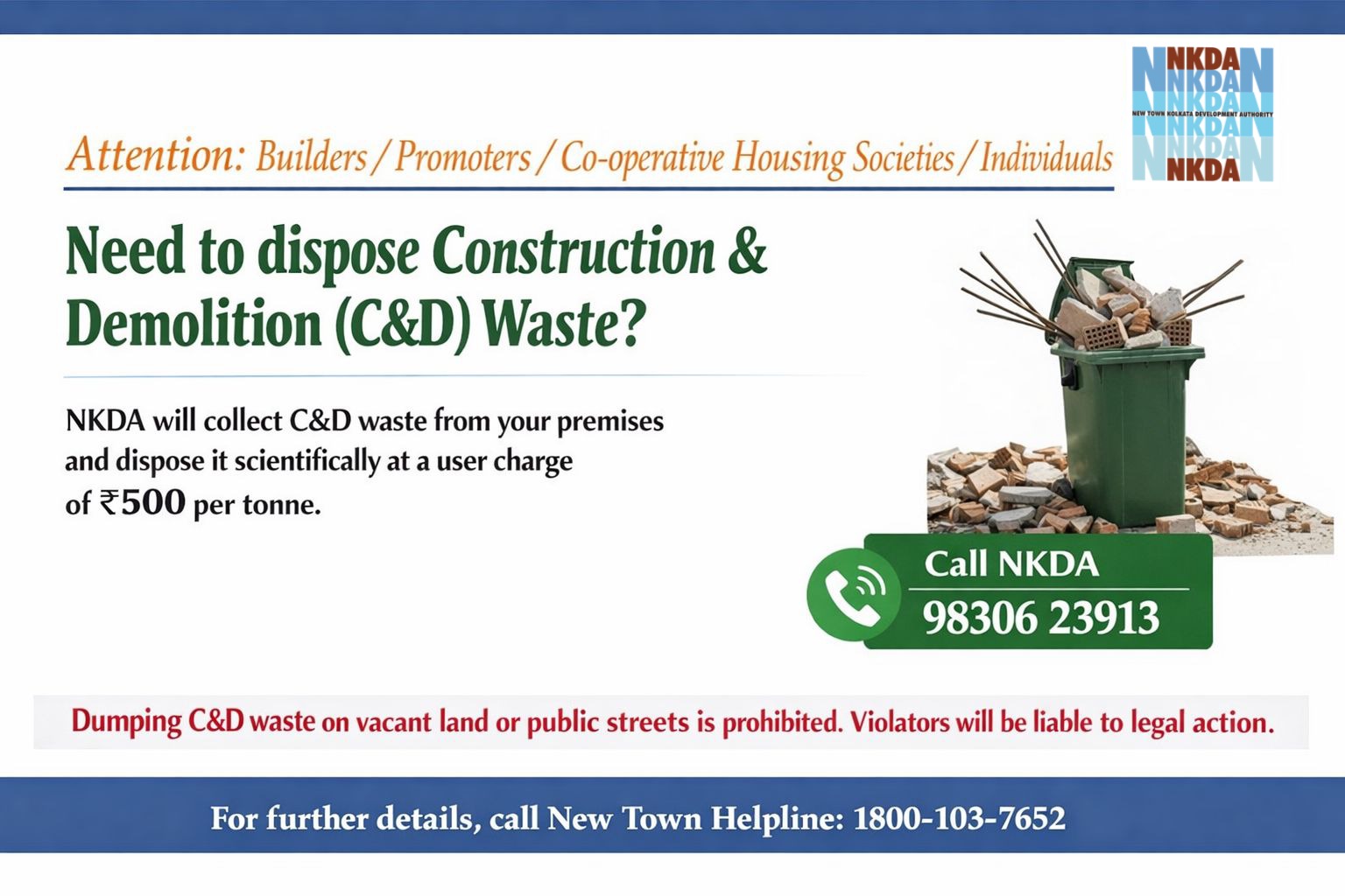 - Construction of NKDA market in between the car parking lot and D.C.P. office at Street No. 45 of Action Area-I, New Town, Kolkata to rehabilitate the street hawkers opening around DLF-I/ Coal India Bhavan and nearby places of New Town, Kollkata.